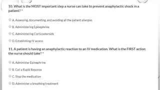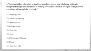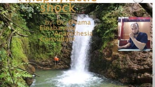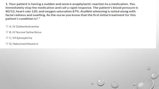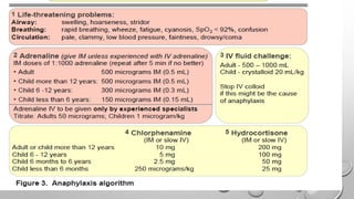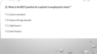 The document defines anaphylaxis as a severe, life-threatening generalized hypersensitivity reaction that is rapid in onset and involves airway, breathing, or circulatory problems along with skin and mucosal changes. It causes include foods, insects, medications, and latex. Fatal reactions typically cause respiratory arrest within 30-35 minutes for foods, collapse within 10-15 minutes for insect stings, and death within 5 minutes for intravenous medications. Symptoms involve various organ systems and progress rapidly. Treatment involves epinephrine, oxygen, fluids, antihistamines, steroids, and positioning the patient depending on their symptoms.