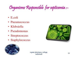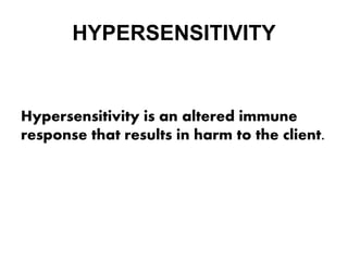 The document discusses different types of hypersensitivity and anaphylaxis. It defines anaphylaxis and describes its incidence, substances that can trigger it, pathophysiology, clinical manifestations, diagnostic evaluation, and management. Nursing management focuses on maintaining airway, supporting circulation, preventing complications, and providing patient education. The document also discusses septicemia, defining it, outlining risk factors, etiology, pathophysiology, clinical signs, diagnostic tests, and treatment including antibiotics and supportive care. Nursing management of septicemia includes infection control, supporting tissue perfusion, and preventing complications.