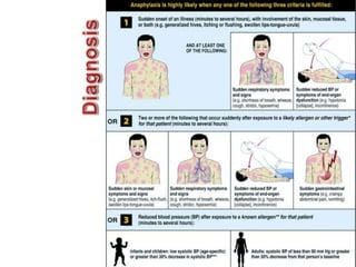 Anaphylaxis is a serious allergic reaction that affects multiple body systems and can cause death. It is caused by an immune system response to an allergen that results in the release of chemicals like histamine from mast cells that cause symptoms. Symptoms can include skin issues, respiratory distress, gastrointestinal issues, and cardiovascular problems. Treatment involves epinephrine injection, antihistamines, corticosteroids, monitoring vitals, and emergency transport if needed. Prevention focuses on having emergency medications available and management plans for high risk individuals.