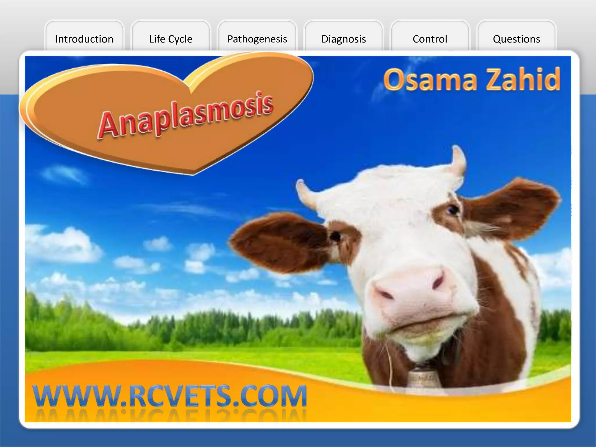 This document discusses anaplasmosis, a disease caused by Anaplasma bacteria that infects the red blood cells of ruminants. It is transmitted by ticks and insects. Clinical signs in mature cattle include fever, anemia, yellow urine, depression, rapid breathing, loss of appetite, decreased milk production, and occasional aggression. Diagnosis can be made by examining blood smears under a microscope or through serological tests. Control involves treating infected animals with antibiotics like oxytetracycline and preventing transmission by ticks and insects.