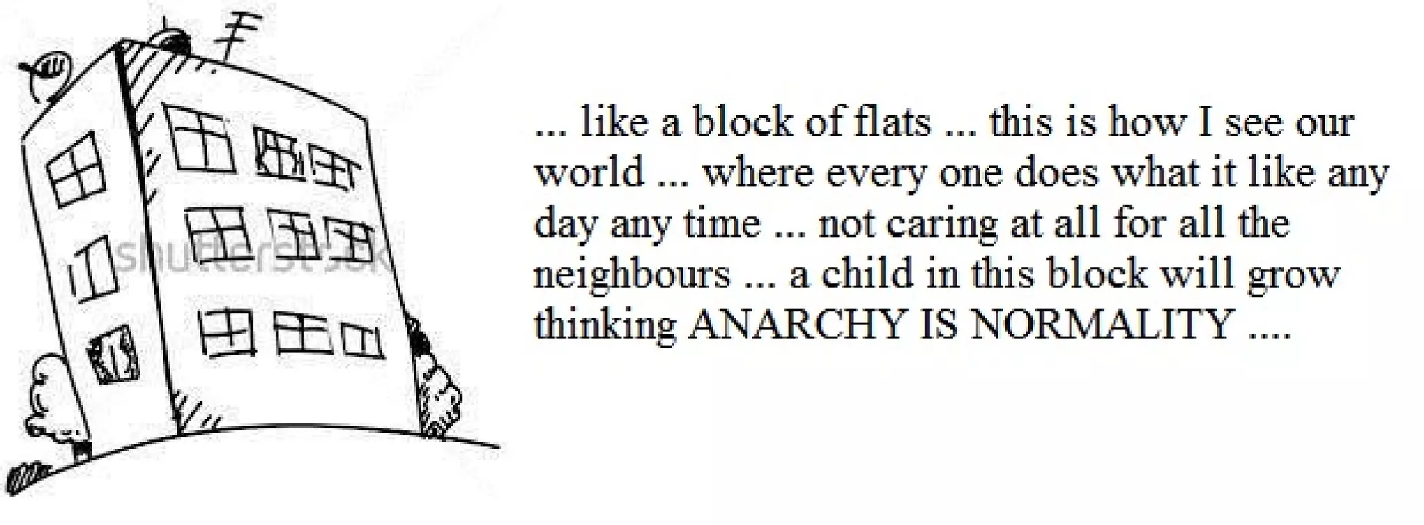 ... like a block of flats ... this is how I see our world ... where every one does what it like any day any time ... not caring at all for all the neighbours ... a child in this block will grow thinking ANARCHY IS NORMALITY ....