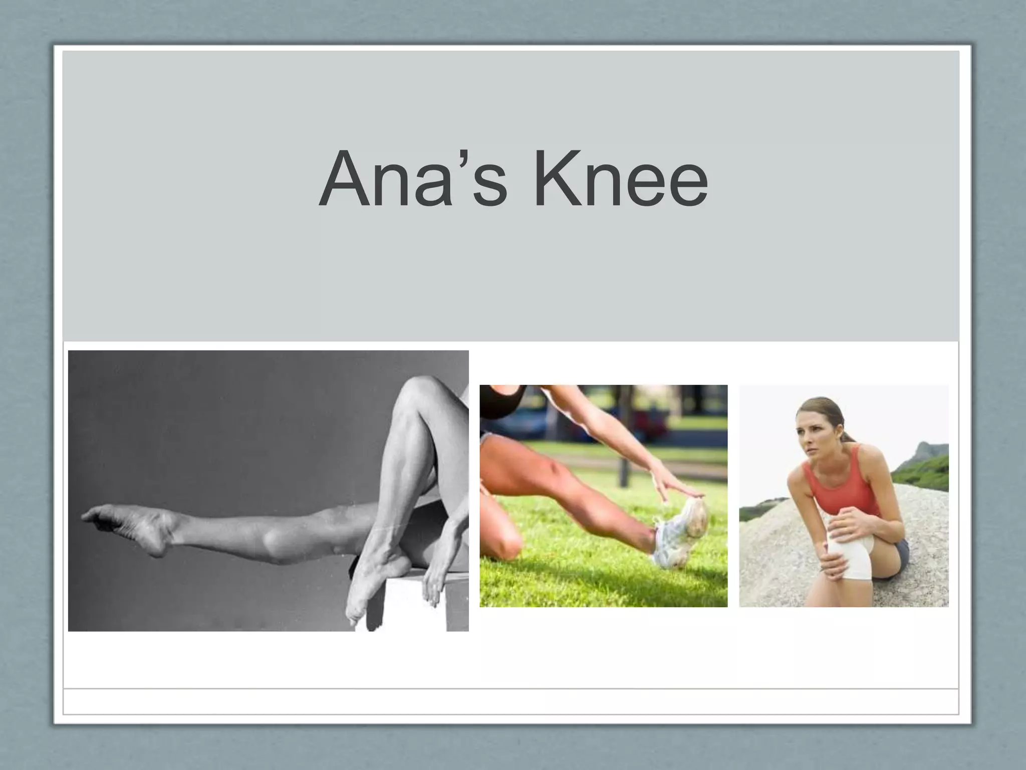 This document describes the anatomy of the knee, including bones, ligaments, muscles, and cartilage. It then discusses common knee injuries such as sprains, ACL tears, and meniscus tears. The author details her symptoms including instability, pain on the inside of the knee, and limitations of motion. She suspects injuries to her ACL, meniscus, and other ligaments based on her symptoms and history of knee injuries from sports. The conclusion recommends getting an MRI to properly diagnose the knee issues.