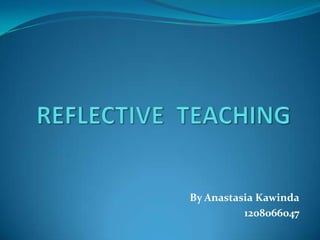 This document discusses reflective teaching and the process involved. Reflective teaching involves self-observation and self-evaluation by teachers to improve the quality of education provided to students. The process involves gathering information such as through teacher diaries, peer observations, recording lessons, and collecting student feedback. Teachers then reflect by thinking about, discussing, reading about, and asking questions about their teaching practices. Reflective teaching is a cyclical process that helps teachers determine if their current approach is best or if changes could be made to improve student learning outcomes.