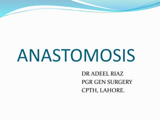 Anastomosis is the surgical connection of two tubular structures, such as joining sections of intestine or blood vessels. The document discusses techniques for intestinal and vascular anastomoses. For intestinal anastomoses, factors like adequate blood supply, careful suturing technique, and patient health and nutrition are essential for safe healing. Vascular anastomoses require precision to ensure immediate watertight closure without damage to the vessel lining. Suturing skills and practice are fundamental for surgeons to successfully perform anastomoses.