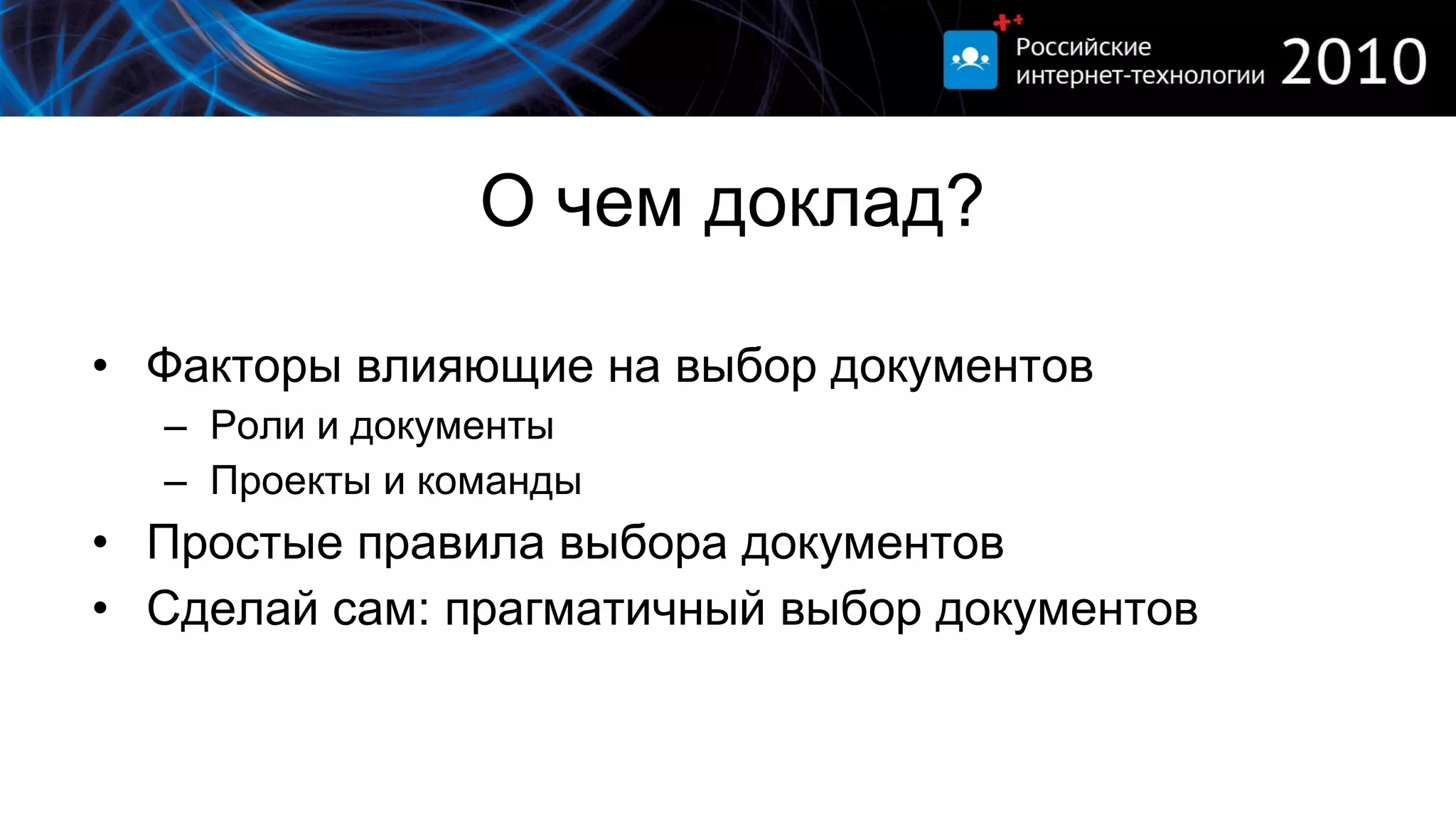 Документ посвящен прагматичному подходу к документированию веб-проектов, описывающему факторы, влияющие на выбор необходимых документов для различных команд и проектов. Рассматриваются роли участников разработки, типы документов, а также правила выбора в зависимости от специфики проекта и команды. Автор подчеркивает важность оптимизации документации и адаптации её под нужды пользователей.