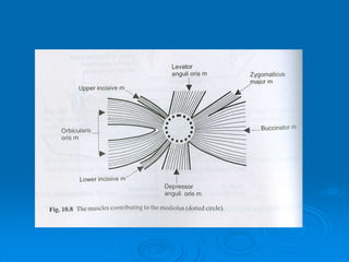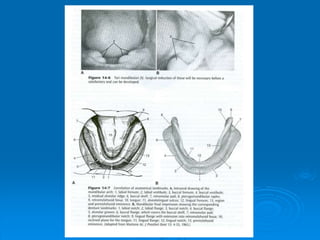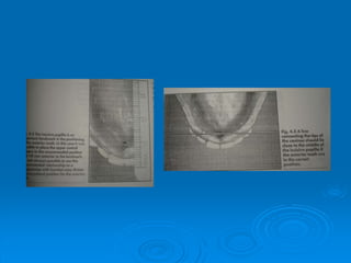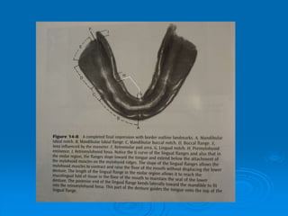 This document discusses important anatomical landmarks for maxillary and mandibular complete dentures. It identifies 14 maxillary landmarks including the labial frenum, labial vestibule, buccal frenum, buccal vestibule, alveolar ridge, tuberosity, hamular notch, hard palate, fovea palatine, midpalatine suture, incisive papillae, and rugae. It also identifies 9 mandibular landmarks including the labial frenum, labial vestibule, buccal frenum, buccal vestibule, buccal shelf area, retromolar pad, and pear shaped pad. A thorough understanding of these