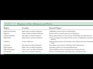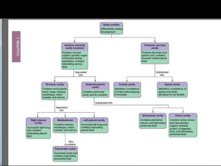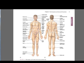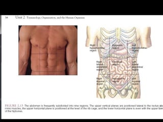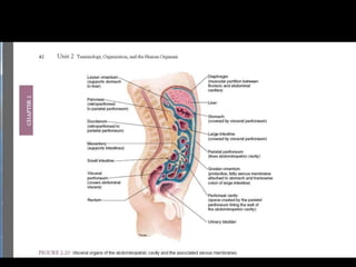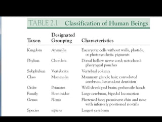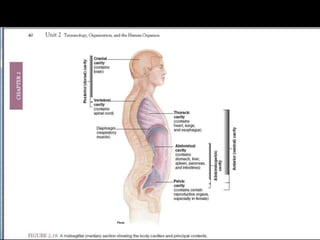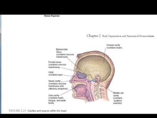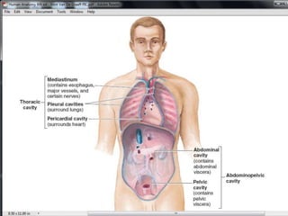 The document describes the classification and characteristics of the human body. It discusses the key features that define humans, including our large brains, bipedal locomotion, opposable thumbs, vocal structures, and stereoscopic vision. It then covers the structural organization of the human body from cellular to systemic levels. Finally, it provides detailed descriptions of the major body regions, cavities, and membranes.