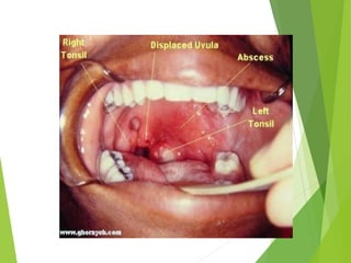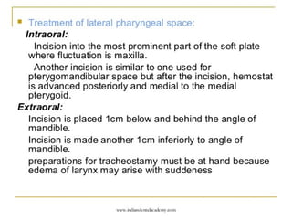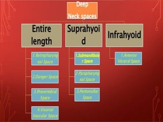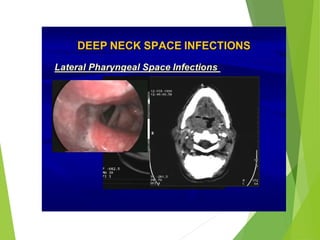 The document discusses the anatomy and clinical considerations of deep neck spaces and cervical fascia, detailing their layers and the structures they contain. It covers potential infections in these areas, their presentations, imaging techniques for diagnosis, treatment strategies, and possible complications associated with deep neck space infections. Key focus is given to distinctions between various spaces, such as retropharyngeal, prevertebral, and parapharyngeal spaces, including treatment protocols and complications that may arise.