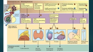 This document provides an overview of the major endocrine glands and their functions. It describes how the hypothalamus and pituitary gland regulate hormone production and release from other glands like the thyroid, parathyroid, adrenals, gonads and more. Key hormones are identified for each gland along with their roles in processes like metabolism, growth, reproduction and maintaining homeostasis. Histology slides are also included to illustrate the cellular structure of the different endocrine tissues.