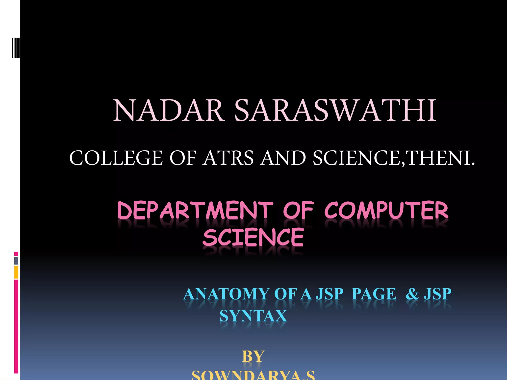 DEPARTMENT OF COMPUTER SCIENCE ANATOMYOF A JSP PAGE & JSP SYNTAX BY NADAR SARASWATHI COLLEGE OF ATRS AND SCIENCE,THENI.