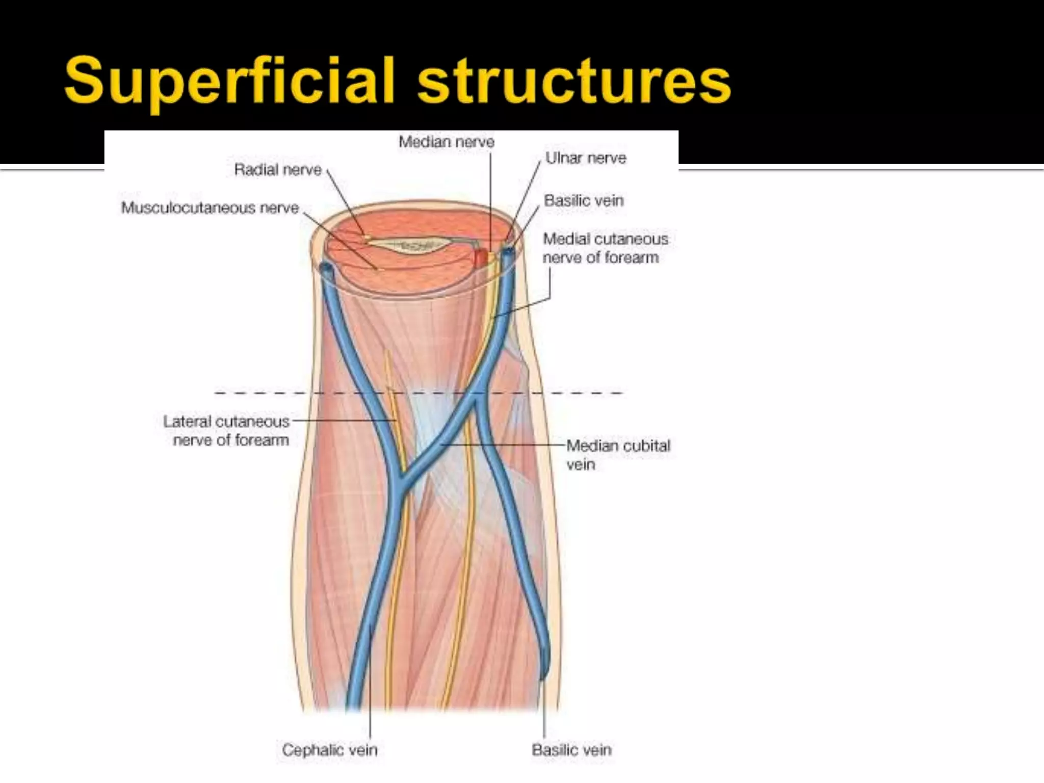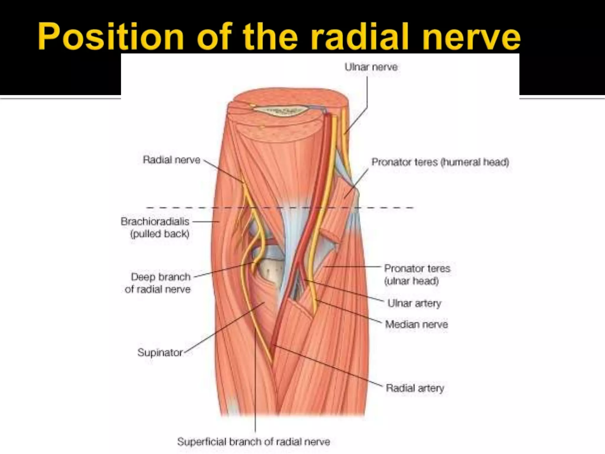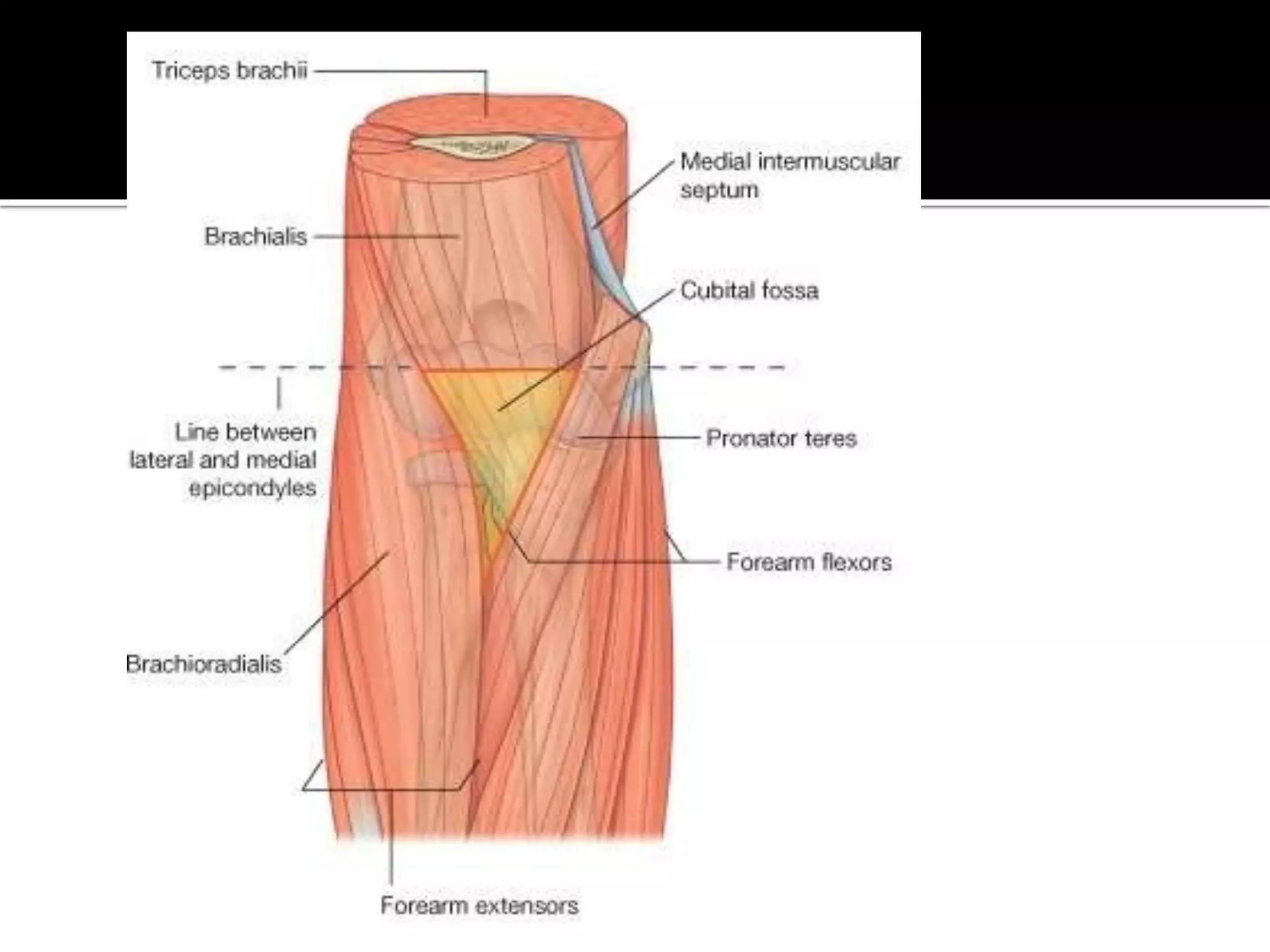 The cubital fossa is located on the anterior surface of the elbow. It is bordered laterally by the brachioradialis muscle, medially by the pronator teres muscle, and its floor is formed mainly by the brachialis muscle. The brachial artery, median nerve, and biceps brachii tendon pass through the cubital fossa from lateral to medial. The radial nerve divides into superficial and deep branches as it passes through the cubital fossa, while the ulnar nerve passes behind the medial epicondyle. Structures passing through or adjacent to the cubital fossa include the median cubital vein and cutaneous nerves of the forearm.