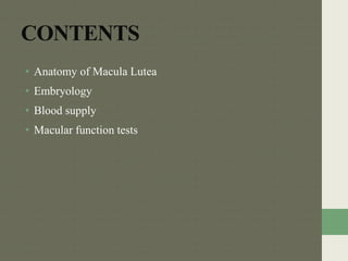 The document discusses the anatomy, embryology, and function tests of the macula lutea. It describes the macula lutea as a 5.5mm circular area at the posterior pole of the retina that subserves central vision. It notes the macula's delayed development until 8 months gestation and specialization of the fovea which contains the highest concentration of cones. The document outlines various macular function tests used to evaluate macular diseases, including visual acuity, Amsler grid, microperimetry, and electroretinography. It provides details on the anatomy and cell layers of the fovea centralis and techniques for assessing macular integrity with tests like the Maddox rod.