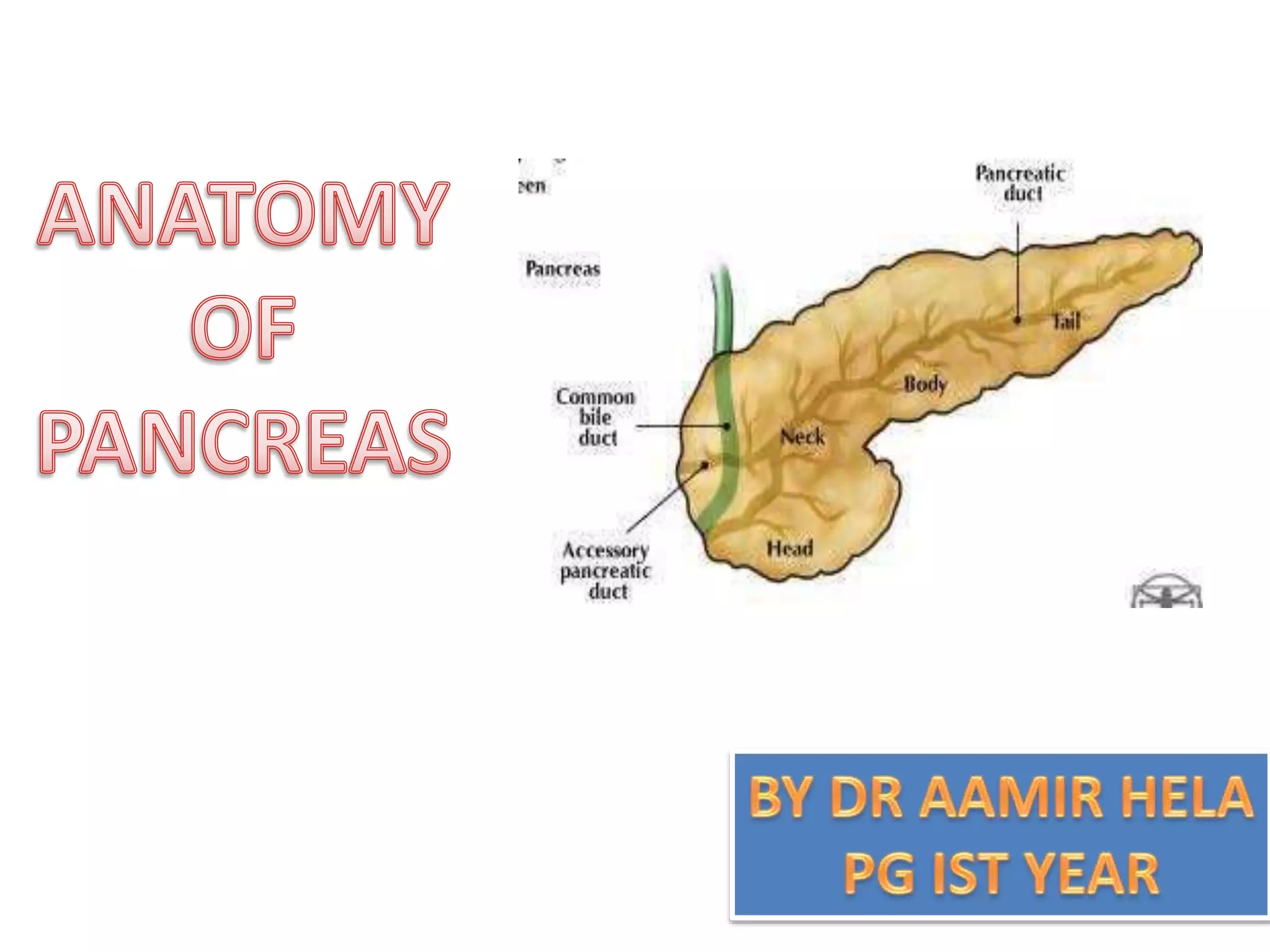The pancreas develops from dorsal and ventral buds originating in the duodenum. During development, the ventral bud rotates posteriorly to fuse with the dorsal bud. The pancreas is located behind the stomach and has both exocrine and endocrine functions. It has a head, neck, body and tail. The main pancreatic duct drains the exocrine pancreas and opens at the major duodenal papilla along with the common bile duct. Developmental anomalies include pancreatic divisum, annular pancreas, ectopic pancreas, agenesis/hypoplasia, and accessory pancreatic lobes.
