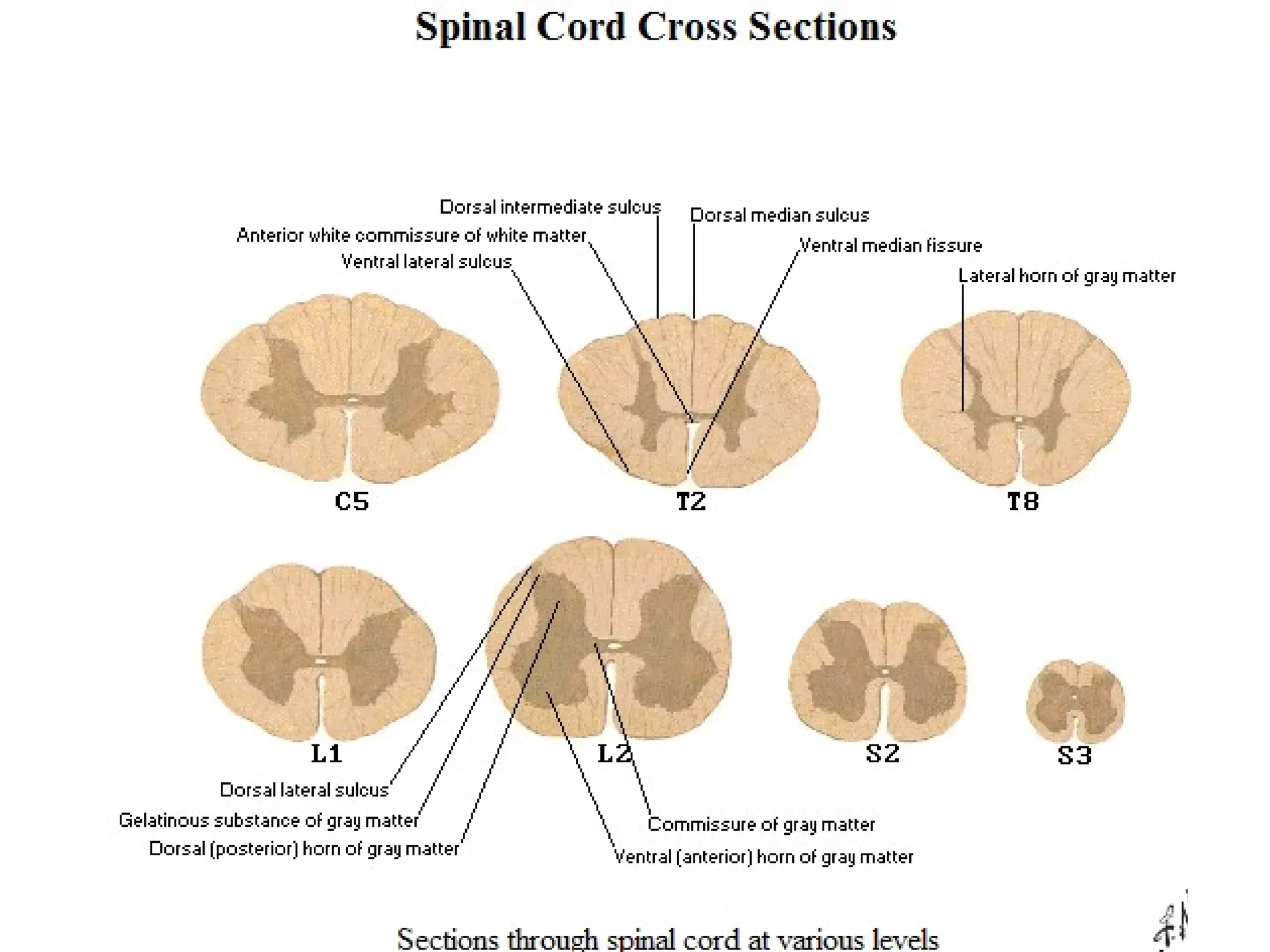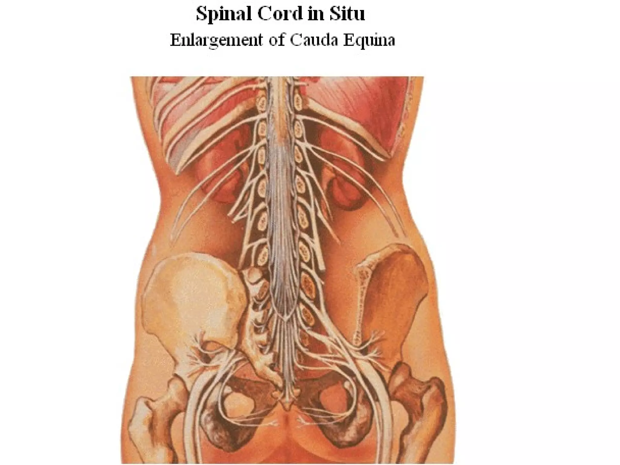 Gross Appearance Cylindricalin shape Foramen magnum L1/L2 (adult) L3 (newborn) Occupies upper ⅔ of vertebral canal Surrounded by 3 layers of meniges: dura mater arachnoid mater pia mater CSF in subarachnoid space
