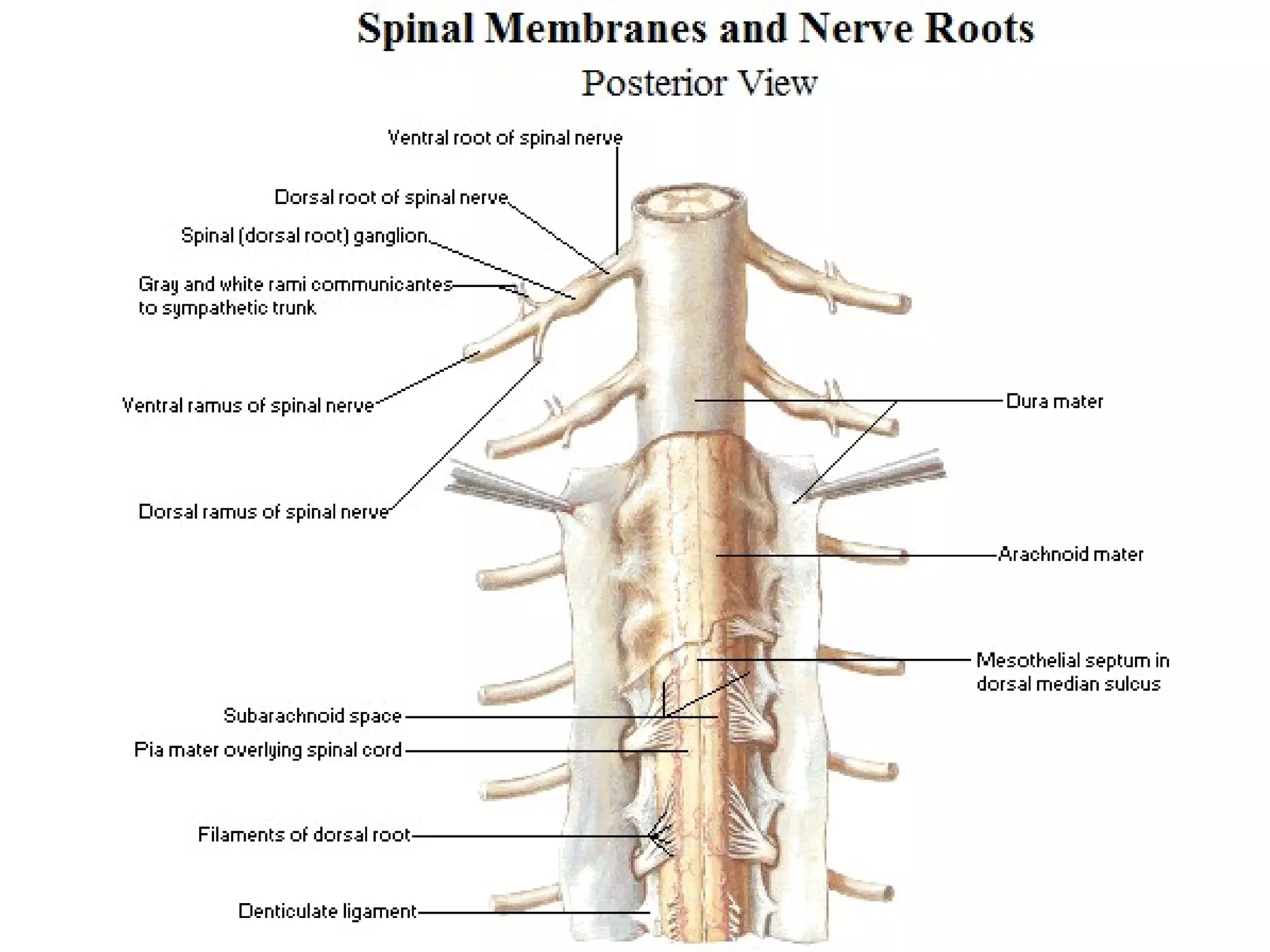 Pia mater Vascularmembrane Closely covers spinal cord Thickened on either side between nerve roots to form the ligamentum denticulatum