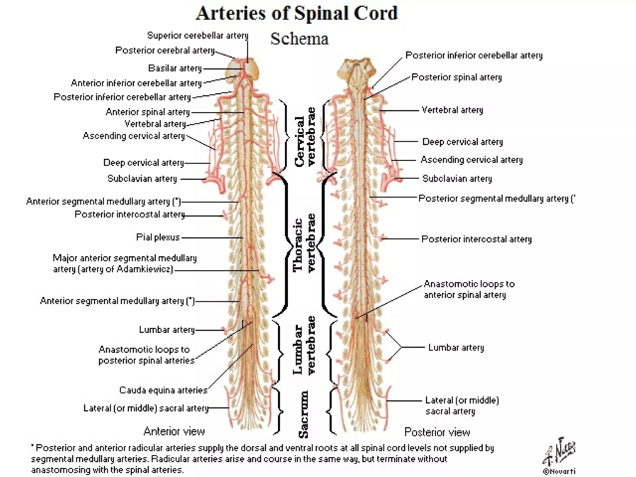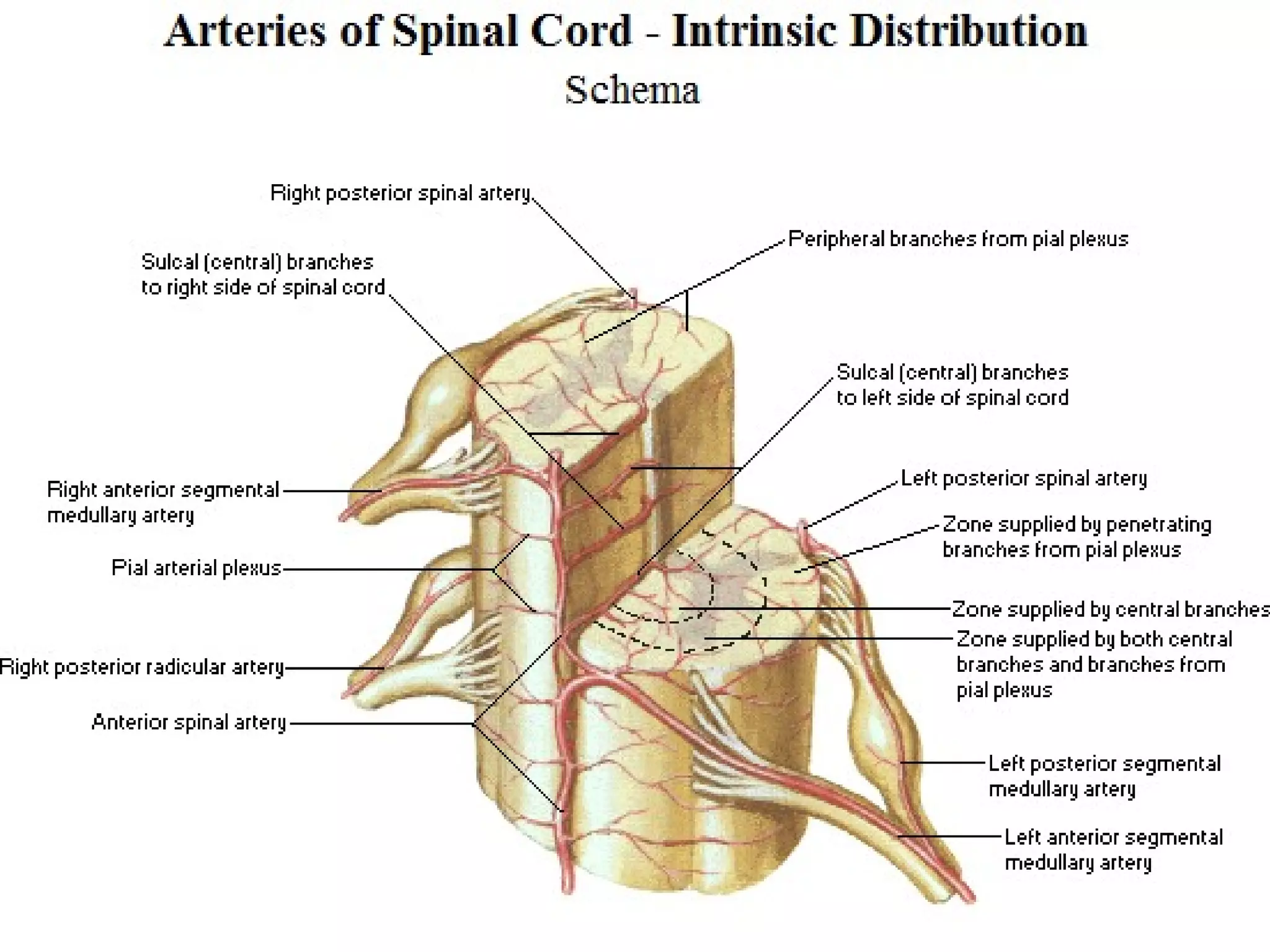 Details on the arteries supplying the spinal cord, including the anterior and posterior spinal arteries.