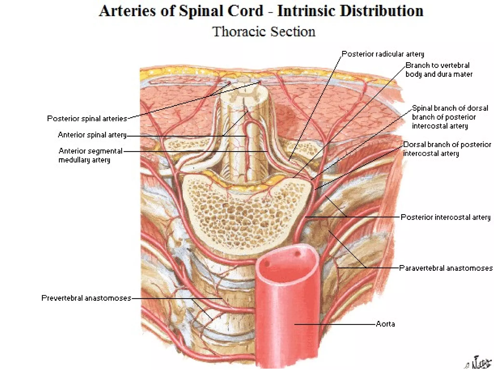 Segmental spinal arteriesBranches of arteries outside the vertebral column Gives off the anterior & posterior radicular arteries Great anterior medullary artery of Adamkiewicz Arise from lateral intercostal artery or lumbar artery at any level from T8 – L3