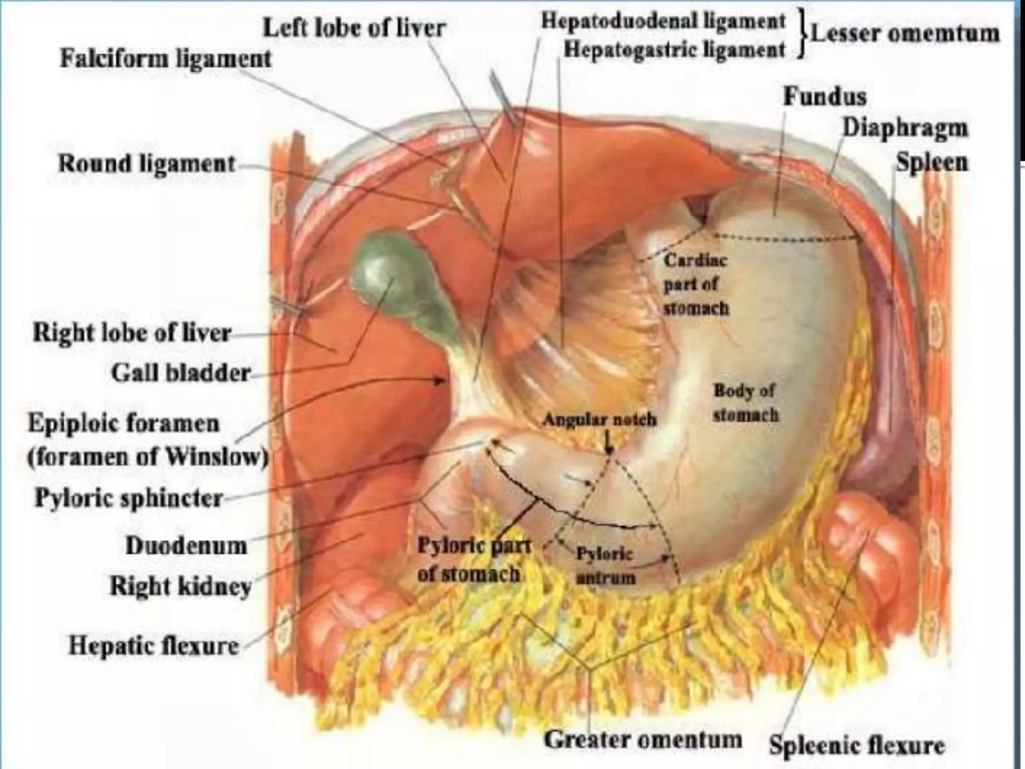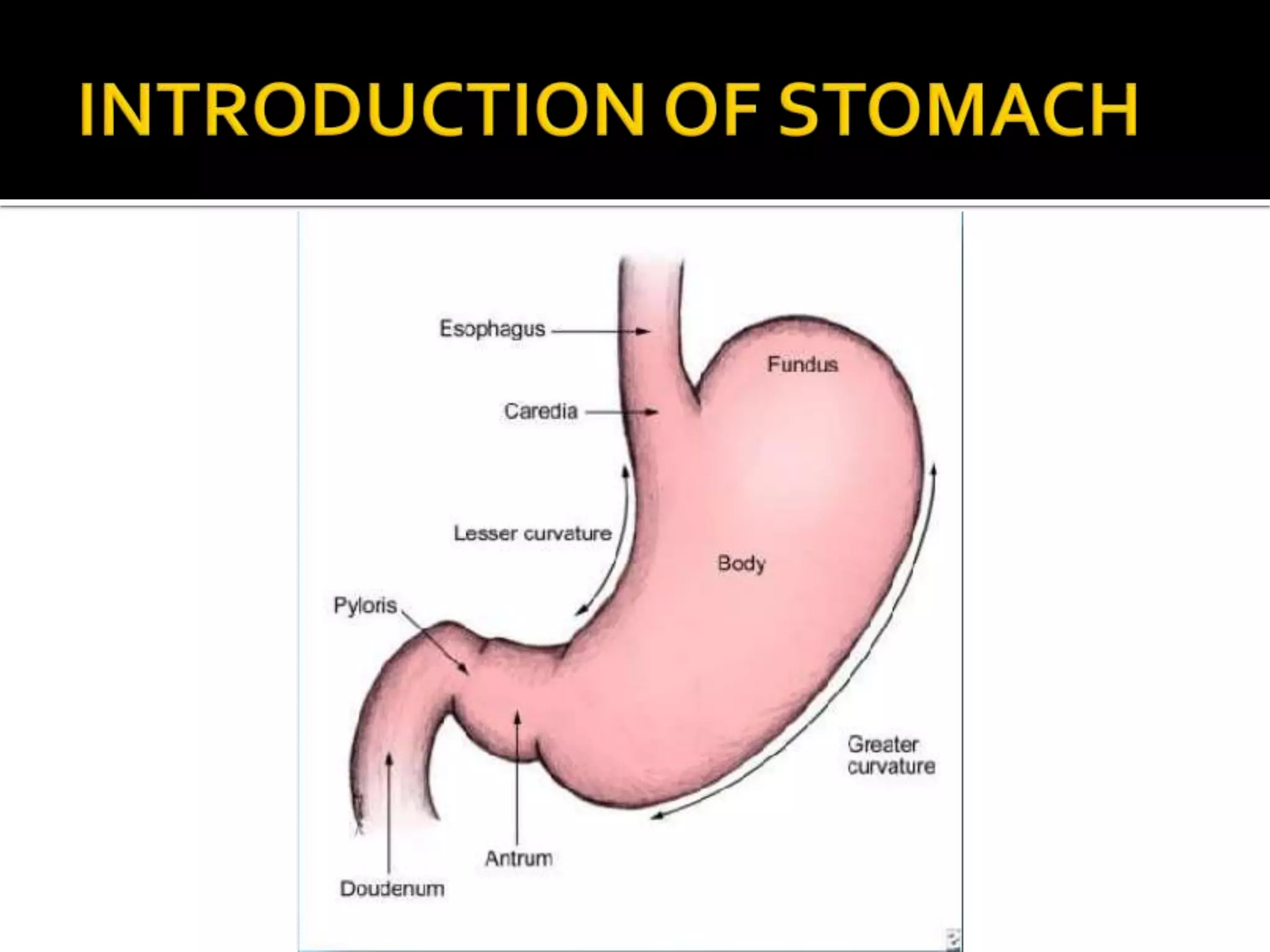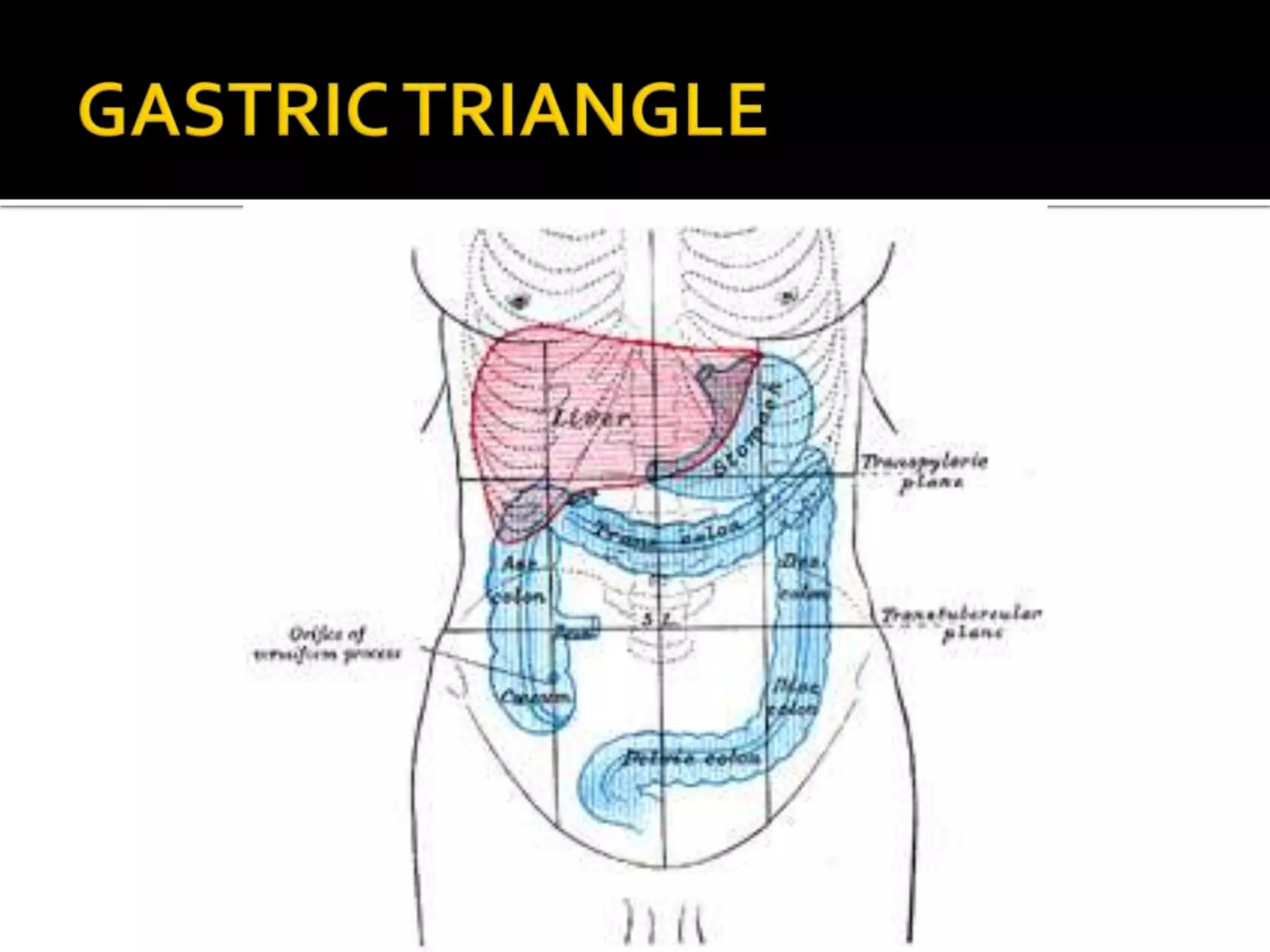 The document describes the anatomy and clinical importance of the stomach. It notes that the stomach has two orifices, two curvatures, two surfaces, and three subdivisions. It lists the various ligaments associated with the stomach and some common stomach conditions. It provides details on the borders and clinical importance of the gastric triangle and Traube's space, including how they are used in certain medical procedures and how they can be affected by other anatomical structures.