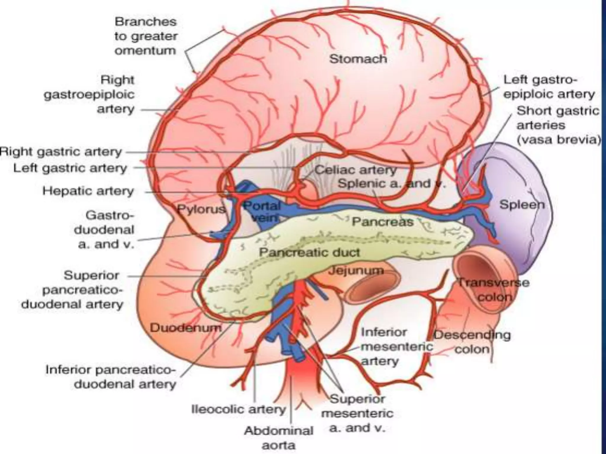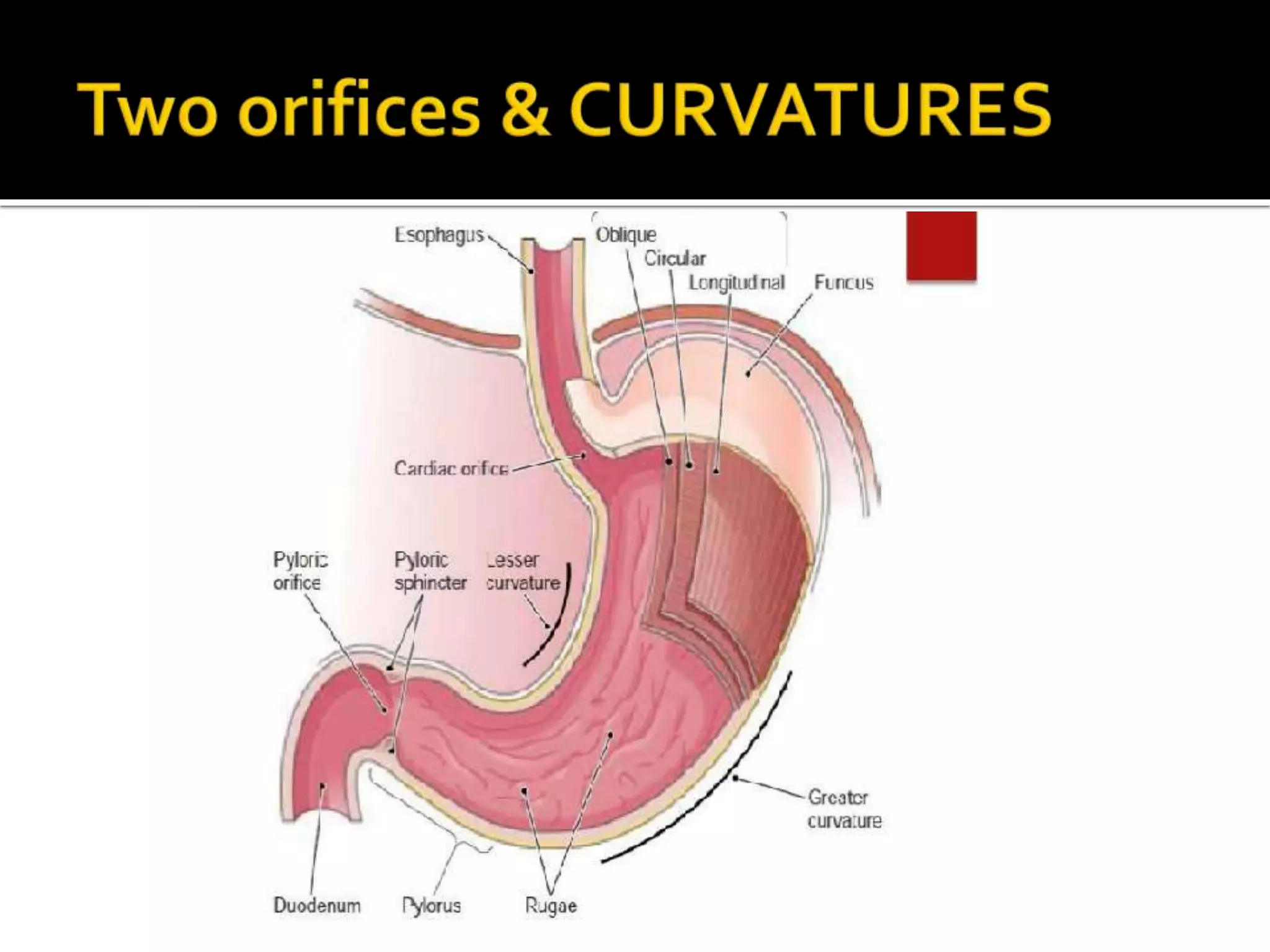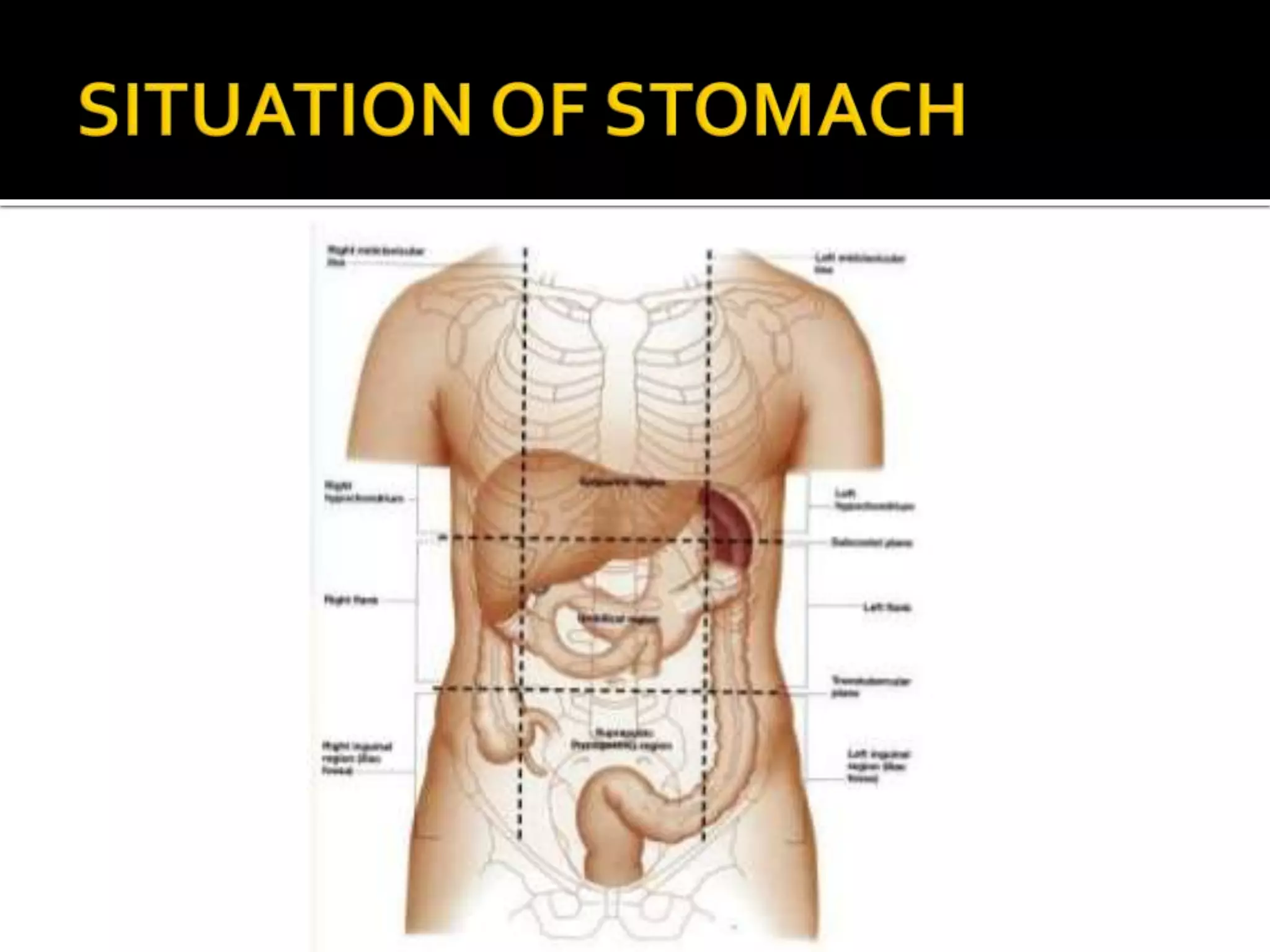 The document describes the anatomy and clinical importance of the stomach. It notes that the stomach has two orifices, two curvatures, two surfaces, and three subdivisions. It lists the various ligaments associated with the stomach and some common stomach conditions. It provides details on the borders and clinical importance of the gastric triangle and Traube's space, including how they are used in certain medical procedures and how they can be affected by other anatomical structures.