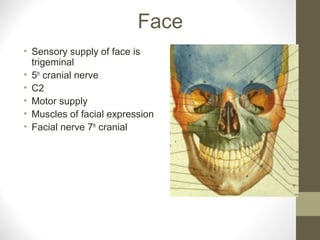 - The sensory supply is the trigeminal nerve (5th cranial nerve) and the motor supply includes the facial nerve (7th cranial nerve) for muscles of facial expression.
