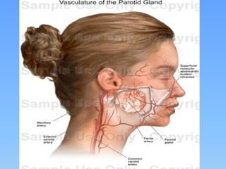 The document details the anatomy and physiology of the parotid gland, the largest salivary gland located near the ear. It describes its structure, boundaries, blood supply, innervation, and clinical notes related to parotid gland conditions such as tumors, parotitis, and Frey's syndrome. The parotid duct's function and potential injuries during surgery are also emphasized.