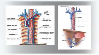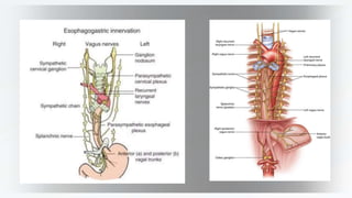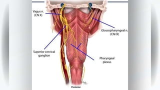 The pharynx is a muscular tube that connects the oral and nasal cavities to the larynx and esophagus. It has three parts - nasopharynx, oropharynx, and laryngopharynx. The pharynx and esophagus receive their blood supply from branches of the external carotid artery and aortic arteries respectively. They are innervated by the pharyngeal plexus, glossopharyngeal nerve, and vagus nerve. The esophagus begins in the neck, passes through the thorax, and ends in the abdomen where it joins the stomach.
