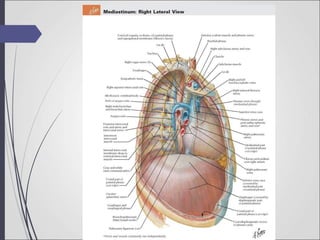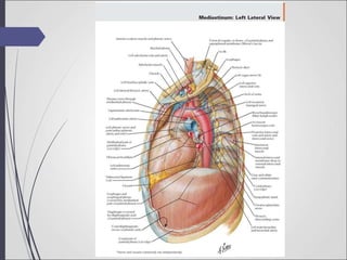 The document discusses the anatomy of the mediastinum, which is the space within the thoracic cavity between the lungs. It is divided into the superior and inferior mediastinum. The superior mediastinum contains structures such as the trachea, arteries like the aortic arch, and nerves including the vagus nerve. The inferior mediastinum is further divided into the anterior, middle, and posterior mediastinum. The middle mediastinum contains the heart within the pericardium. Clinical implications of mediastinal structures and pathology are also summarized.