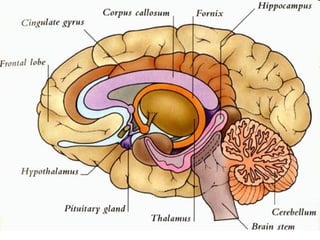 The document outlines the major parts of the brain and their functions. The frontal lobe is responsible for speech, concentration, problem solving and voluntary muscle movement. The parietal lobe interprets sensory information like speech, sounds and touch. The temporal lobe is involved in memory, learning, basic hearing and interpreting sensations. It contains structures like the thalamus, hypothalamus and pituitary gland that regulate functions like sensory reception, hormone secretion, metabolism and emotions. The occipital lobe is responsible for vision. The cerebellum coordinates muscle movement. The brain stem connects the brain to the spinal cord and contains structures that control vital functions like breathing and heart rate.
