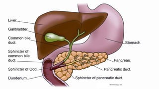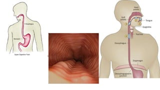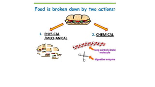 This document describes digestion that occurs in the mouth, esophagus, stomach, and small intestine. In the mouth, food is mechanically and chemically broken down by teeth and saliva enzymes. The chewed food or bolus is then swallowed through the esophagus using peristalsis. In the stomach, the bolus is further broken down by stomach muscles and enzymes in gastric juice. When fully digested, the liquid chyme exits the stomach into the small intestine where bile, pancreatic juice, and bicarbonate aid in further digestion before nutrients are absorbed in the jejunum and ileum.