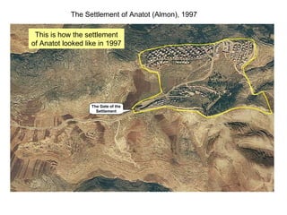 The document summarizes the expansion of the Israeli settlement of Anatot over Palestinian private lands from 1997 to 2011. Originally 195 dunams were trapped within the settlement boundaries in 1997. The gate was moved 720 meters west in 2002, trapping another 460 dunams and limiting Palestinian landowner access. As access became restricted, formerly cultivated Palestinian lands around the settlement were gradually abandoned. In 2011, when a Palestinian landowner brought peace activists to his land in solidarity, settlers from Anatot became angry.