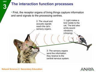 The document describes the interaction function process in 3 steps: 1) A bird's visual (light) and auditory (chirping) signals are captured by a cat's sensory organs. 2) The sensory organs send this information to the cat's central nervous system. 3) The central nervous system processes the information and sends a signal to the cat's muscles to respond by trying to catch the bird.