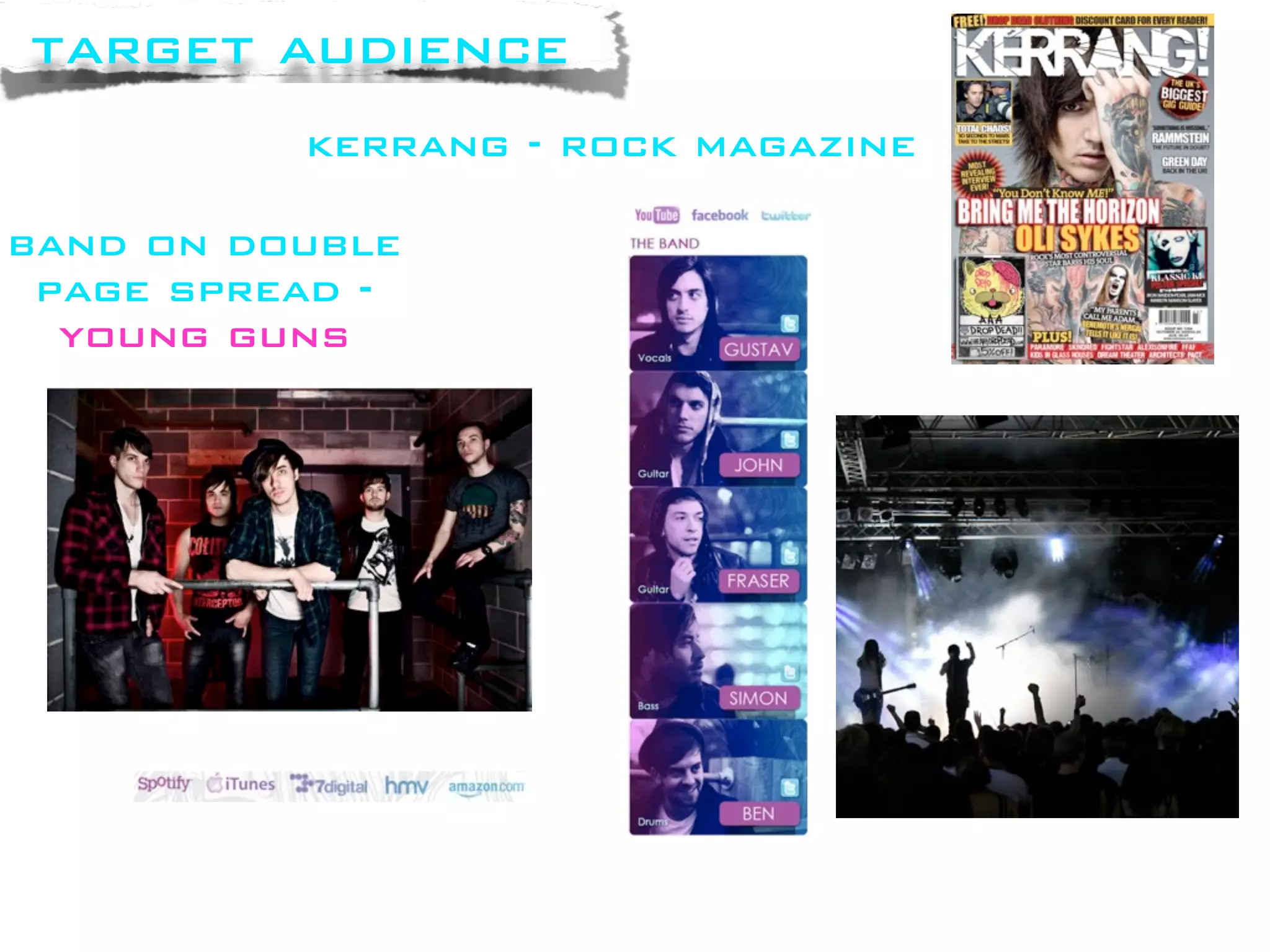 The double page spread in Kerrang magazine features the rock band Young Guns in a casual, relaxed pose. The black and white image takes up most of the page with smaller body text. Bold capitalized fonts are used throughout to stand out.