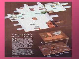 This document provides an overview of ancient Chinese civilization and its earliest dynasties. It describes China's isolation due to geographical features like deserts, mountains, and long rivers. This isolation allowed ancient Chinese civilization to develop with little outside influence. The document outlines the Xia, Shang, and Zhou dynasties, noting achievements like the development of writing, advanced bronze-working, and the establishment of a feudal system. It then discusses the first emperor of the Qin dynasty, Qin Shi Huangdi, who unified China under central rule and standardized laws, currency, and language. Major projects like the Great Wall and the terracotta army in his massive tomb are also summarized.