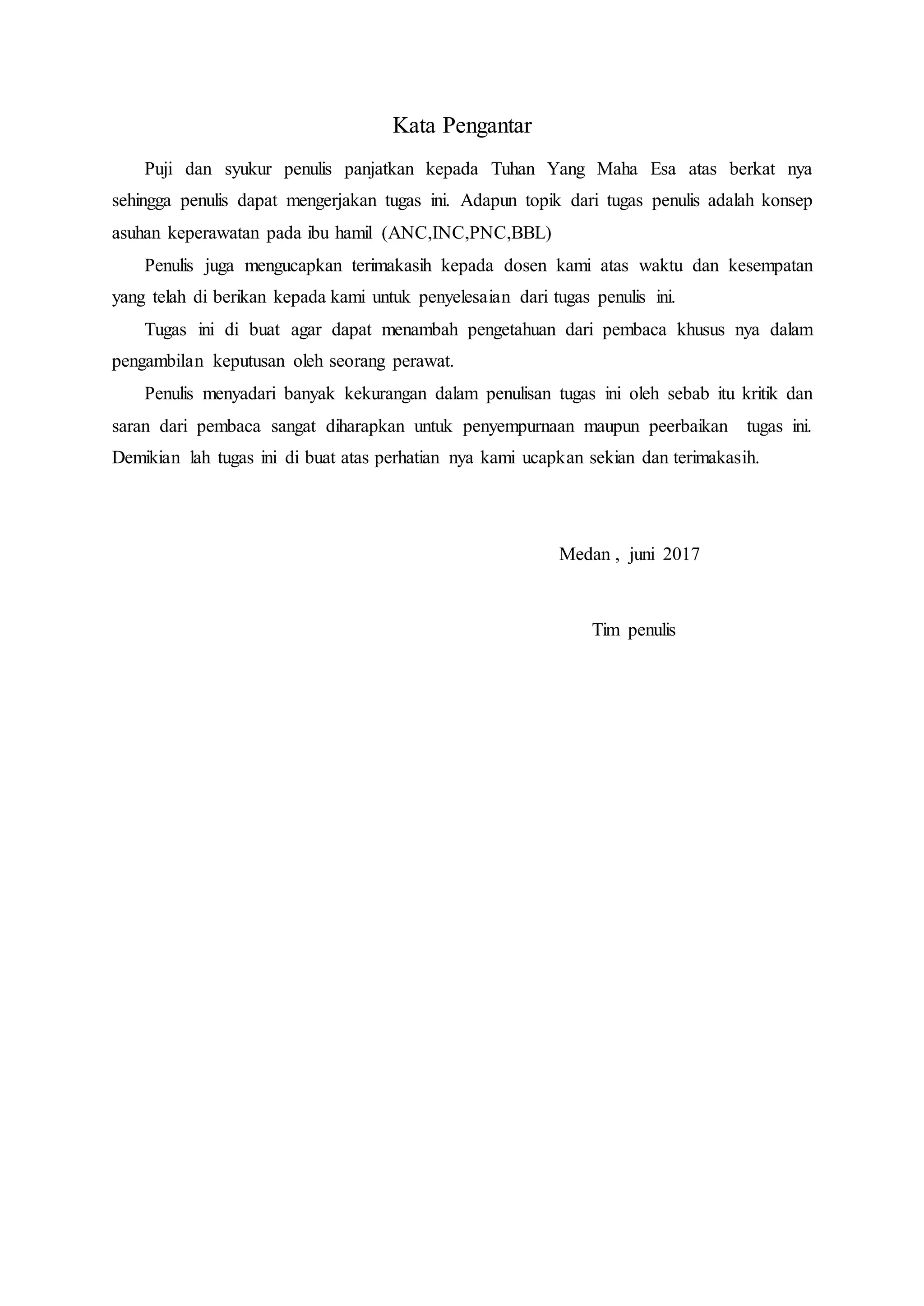 Dokumen ini membahas konsep asuhan keperawatan pada ibu hamil, terutama mengenai antenatal care (ANC), yang bertujuan untuk memantau kesehatan ibu dan janin serta mendeteksi risiko kehamilan. Data menunjukkan bahwa cakupan ANC di Indonesia meningkat, tetapi angka kematian ibu (AKI) masih tinggi, terutama di Sumatera Utara. Penulisan ini bertujuan untuk meningkatkan pengetahuan pembaca mengenai pentingnya pemantauan dan pendidikan kesehatan selama kehamilan.