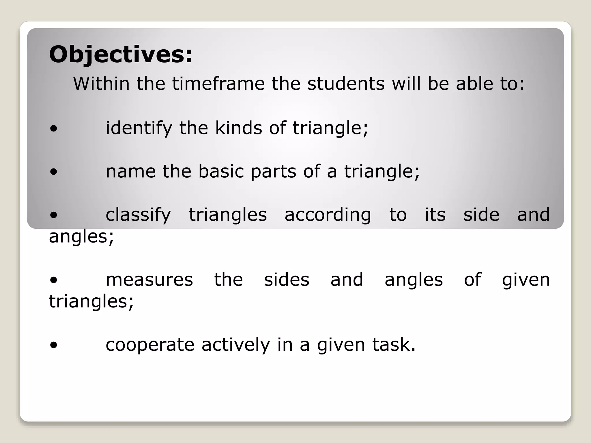 The document discusses triangles, including their parts and different classifications. It defines key concepts like line segments and angles. It then describes how triangles can be classified based on their sides as scalene, isosceles, or equilateral triangles. Triangles can also be classified based on their angles as acute, right, obtuse, or equiangular triangles. The objective is for students to understand triangle terminology and classifications in order to help a carpenter sort triangles by their attributes.