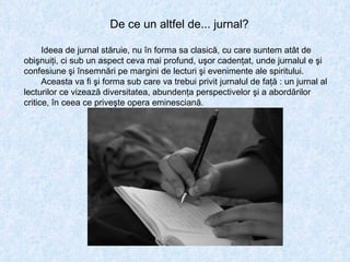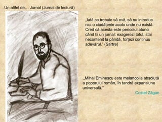 Documentul prezintă un jurnal de lectură în care sunt explorate perspectivele asupra operei lui Mihai Eminescu, evidențiind dialogurile critice dintre diverși autori despre pesimismul eminescian și influența acestuia în cultura română. Jurnalul subliniază importanța receptării globale a operei lui Eminescu în era digitală, precum și complexitățile legăturii sale cu istoria și societatea românească. Cititorul este îndemnat să reflecteze asupra contradicțiilor din gândirea lui Eminescu și asupra moștenirii sale literare, în ciuda schimbărilor sociale.