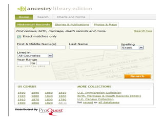 This document provides an overview of the genealogy resources available on Ancestry.com, the world's largest family history website. It allows users to build family trees, search census records, and find birth, marriage, death records and more from various countries. Ancestry.com contains billions of records across collections including census data, military records, immigration records, photos, maps, and user-submitted family trees. The website provides tips for advanced searching and filtering search results.