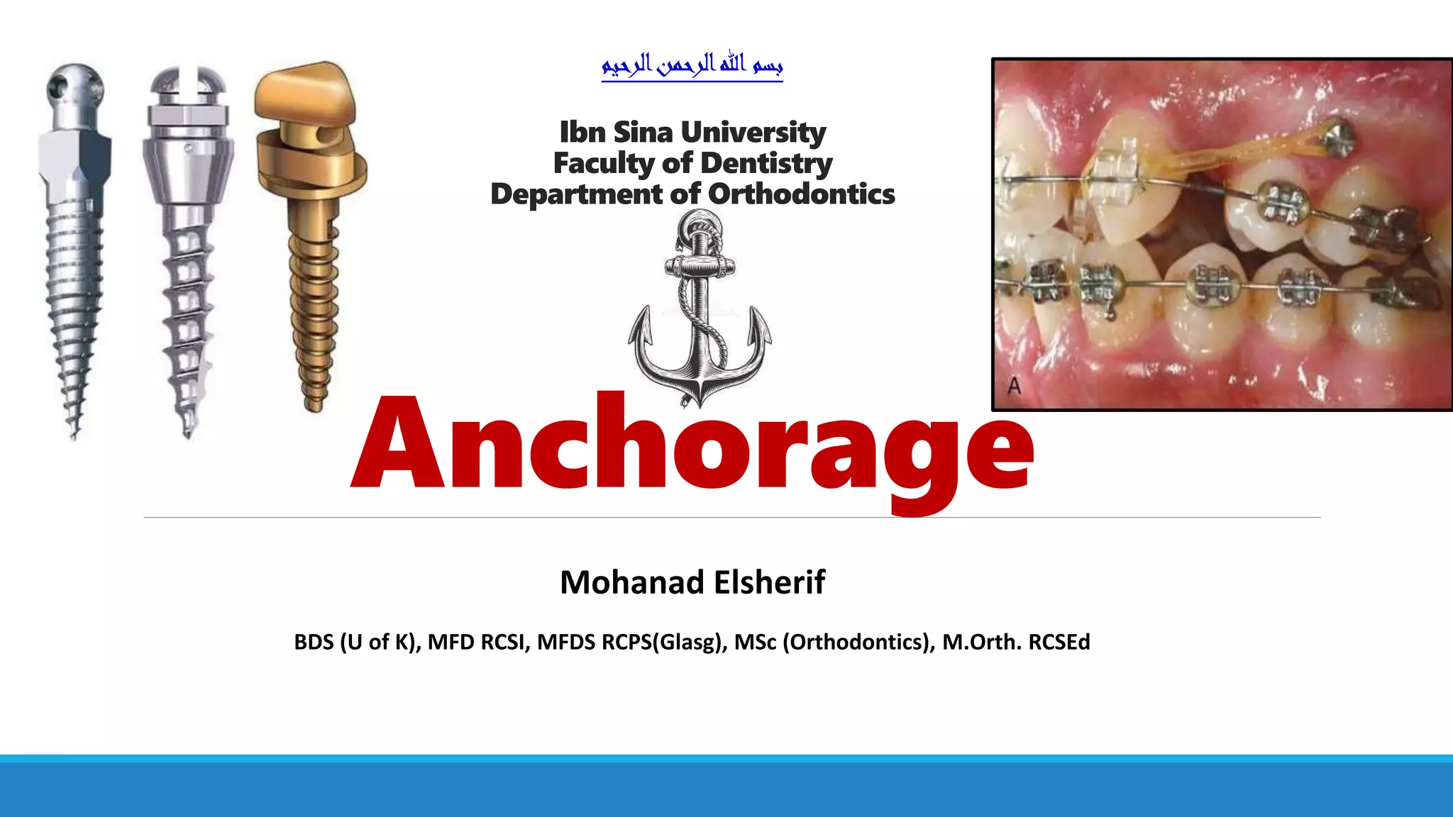 This document discusses anchorage in orthodontics. It defines anchorage as resistance to unwanted tooth movement. Sources of anchorage include intraoral teeth and bone, as well as extraoral structures like the occipital and cervical bones. The value of a tooth as an anchorage unit depends on factors like the number of roots, root size and length, periodontal support, root form, and tooth inclination. Anchorage can be classified based on site, jaw involved, number of units, and manner of force application. Reinforcing anchorage involves adding teeth to the anchorage unit, moving teeth gradually, using light forces, and employing devices like lingual arches, TADs, and extraoral appliances. Anch