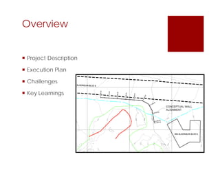 The document summarizes a project to construct an anchored secant pile wall alongside a highway and neighboring properties to stabilize an area affected by a mine subsidence. Key details include that 109 overlapping concrete caissons ranging from 4-20m deep were drilled and reinforced with steel beams to form the wall. Challenges arose from inaccurate bedrock information that required caissons to be drilled deeper than anticipated, increasing steel needs. Through tracking systems and stockpiled inventory, solutions were found to acquire necessary materials and limit downtime to complete the project on schedule. The document emphasizes that contingency planning is crucial given uncertainties and that organization is key to managing challenges that arise and keeping projects on track.