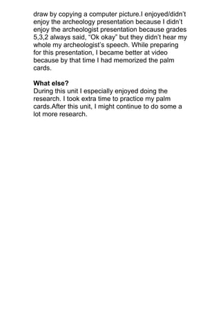 The student reflects on their experience learning about ancient Egypt. They enjoyed taking notes during research as it allowed them to learn a lot of information from books. They found food the easiest research topic. Designing artifacts was difficult as it was hard to think of them all. A key part of Egyptian society was men often holding two jobs. Education was important as it allowed children to learn writing. The student was proud of their report which included a video and writing, and felt they improved their knowledge of Egyptian clothing. Presenting their artifacts was challenging as some broke, and memorizing the palm cards was hard. They enjoyed pottery the most to make. While preparing for their presentation, their video skills improved from practicing the palm cards.