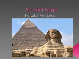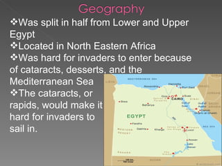 Ancient Egypt was divided into three main kingdoms - the Old Kingdom (2700-2200 BC), Middle Kingdom (2050-1750 BC), and New Kingdom (1550-1050 BC). Some key events included Menes uniting Upper and Lower Egypt around 3100 BC, the Hyksos invading and ruling during the Middle Kingdom, and Egypt expanding its empire during the New Kingdom under rulers like Hatshepsut.