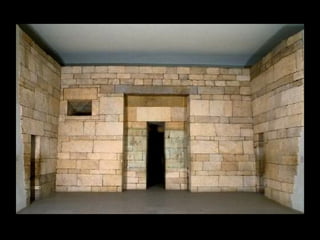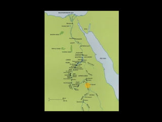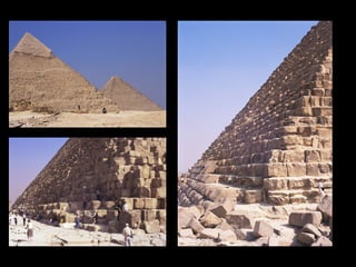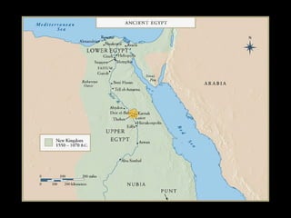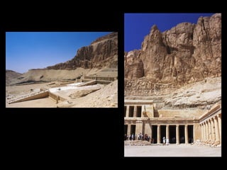 This document provides an overview of ancient Egyptian art from the Predynastic period through the Roman period, highlighting key styles, sites, and works. It features over 100 images and descriptions of artifacts ranging from the Palette of King Narmer from 3,000 BCE to Faiyum portraits from the 2nd century CE. The art progressed from early tomb paintings and reliefs to monumental sculptures and architecture, including mastabas, pyramids like those of Djoser and Khufu, temples such as Karnak and Abu Simbel, and Amarna period works depicting Akhenaten and Nefertiti.
