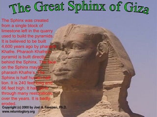 The Great Sphinx of Giza was carved from limestone during the reign of Pharaoh Khafre around 4,600 years ago and stands guard behind Khafre's pyramid. The Egyptians built pyramids as tombs for pharaohs and their queens starting before the Old Kingdom, with the three largest at Giza constructed over three generations for Khufu, Khafre, and Menkaure. While it was once believed that slaves built Khufu's pyramid, it was actually constructed by 100,000 workers during the Nile's annual flooding. The Pyramid of Saqqara was the first to be built out of stone blocks rather than mudbrick and served as the prototype for later