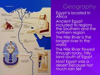 Egypt is located in Africa and contains two regions - Southern Egypt and Northern Egypt. The longest river in the world, the Nile River, flows through Egypt from South to North through generally rocky, hilly, and desert terrain with little rainfall. Ancient Egypt developed along the Nile River and was divided into three main historical periods - the Old Kingdom, Middle Kingdom, and New Kingdom.