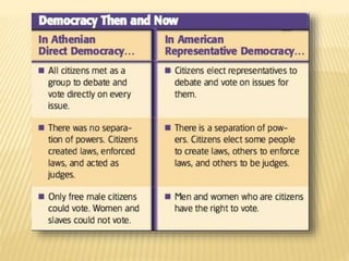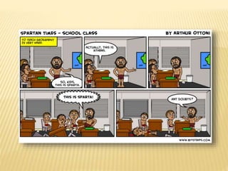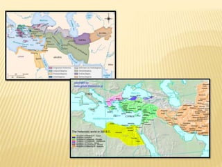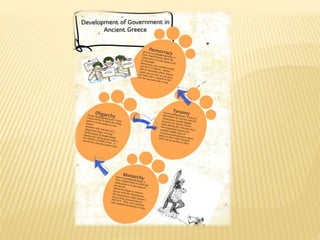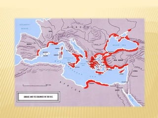 Ancient Greece developed along the Mediterranean coast and islands between 3000 BC to 30 BC. The civilization was never unified but shared a common language, religion, and culture. City-states called poleis governed independent territories and included democratic Athens and military Sparta. Athens and Sparta vied for power during the Classical period, fighting the Persian Wars and Peloponnesian Wars. Alexander the Great then conquered Greece and spread Greek culture across his vast empire before it was divided after his death, ushering in the Hellenistic period until Roman domination by the 1st century BC.