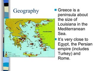 Ancient Greece was a peninsula in the Mediterranean Sea around the size of Louisiana. It had a mountainous geography which led Greek city-states to develop independently and often fight each other. The Greeks invented many technologies like naval ships, aqueducts, cranes, and siege weapons out of necessity. Athens was a direct democracy where male citizens could vote on policies, though most of Greece was ruled by monarchs or oligarchies. Alexander the Great spread Greek culture and ideas throughout Asia after conquering the Persian Empire.