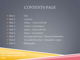 This document provides an overview of ancient Greece, including daily life and government structures in Athens and Sparta. It also provides biographical information about Alexander the Great and details his vast empire. The document contains 9 slides covering Athens and Sparta with descriptions of daily routines and how each city-state was governed. It also includes 2 slides on Alexander the Great's early life and his conquests across Europe and Asia to form one of the largest empires in the ancient world. Sources are listed at the end.