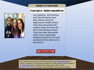 The document describes a virtual museum on ancient Greece that contains information on Greek gods/goddesses, women in society, battles between Athens and Sparta, and the wisdom of Socrates. The museum contains artifacts and descriptions related to these topics to educate visitors on aspects of ancient Greek philosophy, gender roles, and mythology. Visitors are welcomed to explore the various rooms and artifacts of the museum to learn about these important facets of ancient Greek culture and society.