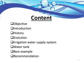 The document discusses the ancient irrigation systems and practices of Sri Lanka, highlighting their historical significance and evolution, particularly in the dry zone. It details the various types of irrigation methods, such as tank-based and canal-based systems, as well as key structures and components involved in their construction. Additionally, it emphasizes the importance of these systems in sustaining agriculture and provides recommendations for preserving their legacy.