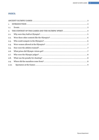 The document provides information about the ancient Olympic Games held in Olympia, Greece. It discusses the events included such as running, long jump, wrestling, boxing, and chariot racing. It also describes the context and spirit of the Games, explaining they were part of a major religious festival honoring Zeus and featured political rivalries between Greek city-states. Only free Greek men could compete for the glory of victory, which brought fame to themselves and their hometowns.